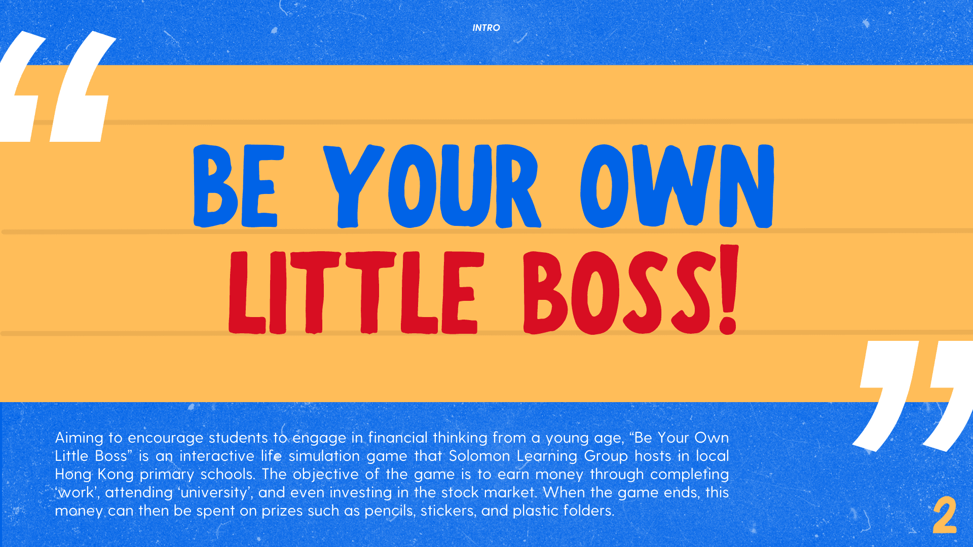 I redesigned the prizes for Solomon's elementary school event "Little Boss", a game in which students could earn money from "working" and "investing". When the game ends, students can spend the money on prizes like pencils, stickers, and notebooks; however, I noticed that the students were generally uninterested in the existing prizes and lacked motivation for the game.